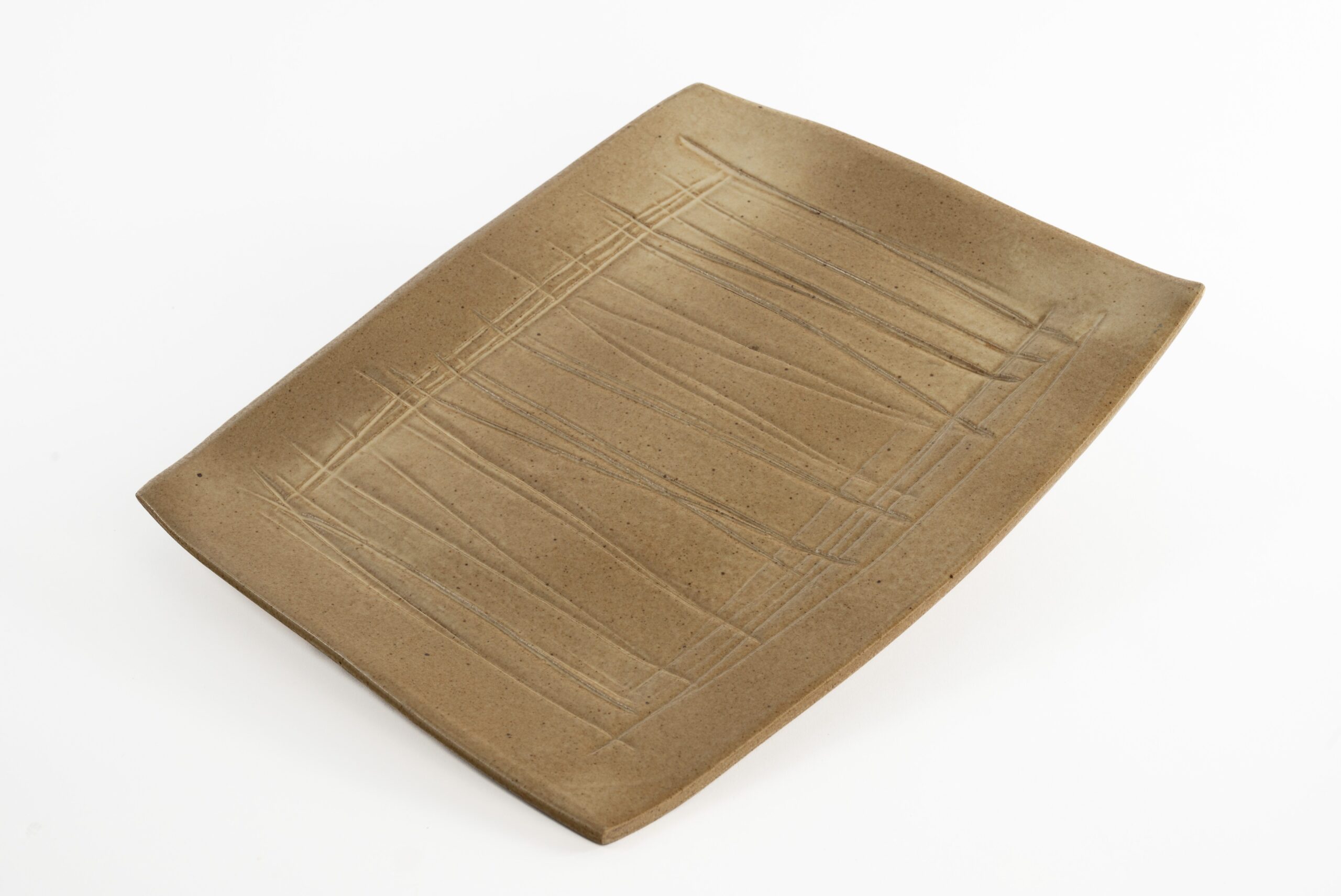 Travessa retangular de cerâmica em tom terroso com textura gravada sutil.